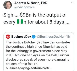 Nevin wrote on his twitter handle that ” … $9Bn is the output of every Nigerian n for about 8 days.”