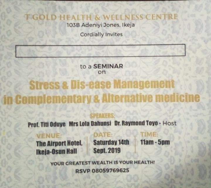 T- GOLD Health and Wellness Centre is inviting Nigerians to a seminar on Stress and Dis-ease Management and Alternative medicine.