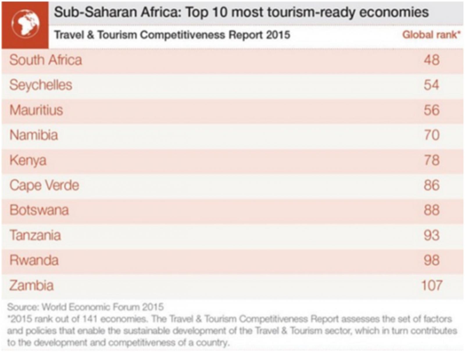 According to the WEF report, South Africa tops the African region and ranks 48th globally, Seychelles comes second, followed by Mauritius, Namibia, Kenya, Cape Verde, Botswana, Tanzania, Rwanda and Zambia, says the WEF Travel and Tourism Competitiveness Report 2015, released on the sidelines of the WEF on Africa.