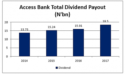 While its profit before tax also leapt 46 per cent from N42.415billion in 2014 to N61.9 billion in 2017, Access Bank has been consistent in the payment of dividends which has also grown in the last four years by 34 per cent from N13.7 billion in 2014 to N18.5 billion in 2017.