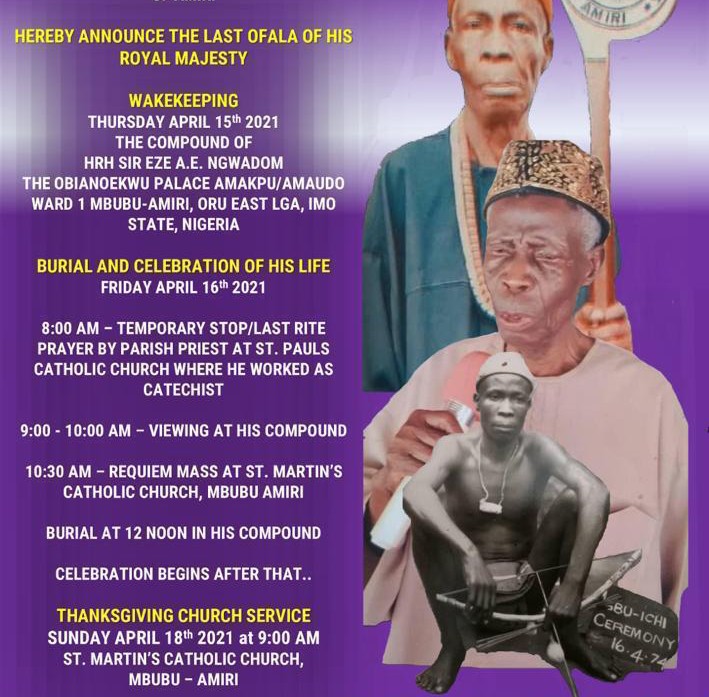 The Ngwadom Royal Family, the Obi-In-Council and the entire Amiri community of Oru Local Government, Imo State, have announced programmes for burial and last Ofala festival of their departed king, His Royal Majesty, Efelemegide Alphonsus Ngwadom.