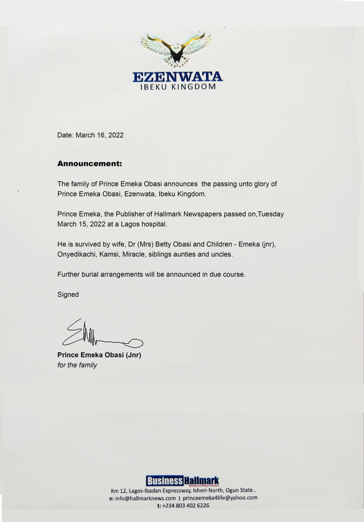 Prince Emeka, the Publisher of Hallmark Newspapers passed on, Tuesday March 15, 2022 at a Lagos hospital.