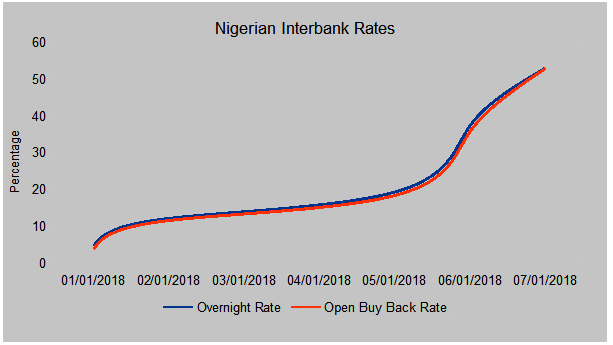 Overnight rate spiked to 53.08 per cent on Wednesday from 37.42 per cent the previous day, which is the high it has reached since April 2017 when it got to 64.58 per cent.