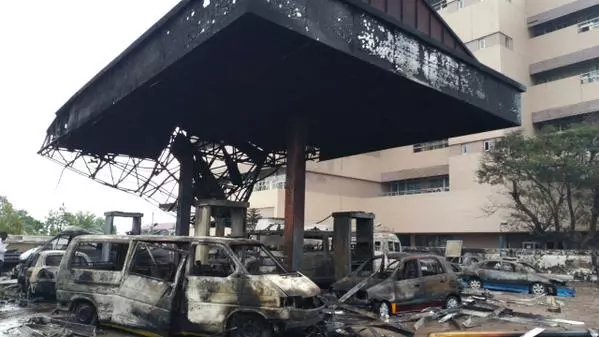 Charred corpses and wreckage of about a dozen cars and mini buses littered the forecourt of the station, where security forces kept an anxious crowd behind a police cordon.