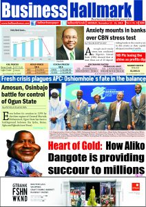 Cover Story Business Hallmark Cover Page for this week Published 7 years ago on November 11, 2018 By Felix OLOYEDE See more Related Topics: Leave a Reply Cancel replyYour email address will not be published. Required fields are marked *Comment * Name Email Website Save my name, email, and website in this browser for the next time I comment. {{#message}}{{{message}}}{{/message}}{{^message}}Your submission failed.The server responded with {{status_text}} (code {{status_code}}). Please contact the developer of this form processor to improve this message. Learn More{{/message}}{{#message}}{{{message}}}{{/message}}{{^message}}The server responded with {{status_text}} (code {{status_code}}). Please contact the developer of this form processor to improve this message. Please contact the developer of this form processor to improve this message. Learn More{{/message}}Submitting… Most Engaging Politics4 days ago UNN disowns Uche Nnaji, Tinubu’s minister’s degree certificate – Report Politics2 days ago Certificate Forgery Scandal: Obi demands prosecution as Uche Nnaji admits UNN never issued him degree Business1 day ago Saudi, Canada, Bangladesh, others join $10bn investment drive in Northern Nigeria Politics3 days ago Otti’s Landmark projects signal Abia’s total revival – survey Politics3 days ago Garba Shehu once urged Buhari to accept Boko Haram nomination – now denies it Business3 days ago Tony Elumelu to headline Abuja Business and Investment Expo 2025