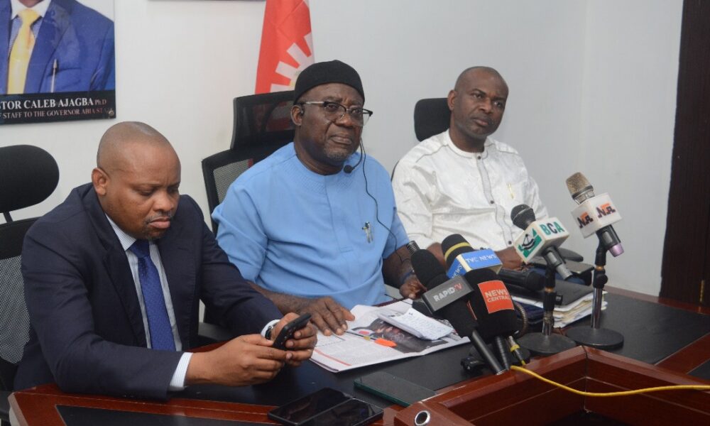 Abia Commissioner for Information, Prince Okey Kanu, flanked by the state’s Attorney General (left) and S.A Media and Publicity to the Governor (right) at the briefing ...