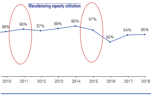 Manufacturing Capacity Utilization: The average manufacturing capacity utilization between years 2011-2014 was 58% compared to 54.3% it averaged in years 2015-2018. The inherent challenge of electricity supply to factories remain significant and it is observed that power supply to factories from distribution companies dropped from daily average of 13 hours in 2015 to 7 hours in 2018.