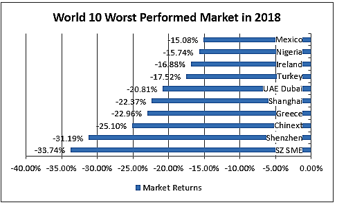 The Nigerian market which was of the best performed market globally last year after posting 42.3 per cent return, was ranked by the World Market Index as the market with worst return in November 2018, dipping -9.1 per cent during this period. Data obtained from the Exchange showed that it has shed-19.27 per cent year-to-date, making it the ninth worst performed market between January 2 and November 30, 2018, with Small and Medium Enterprise Board of the Shenzhen Stock Exchange (SZ SME), which has dipped -33.74 per cent YTD, topping the worst performed markets list for this year.