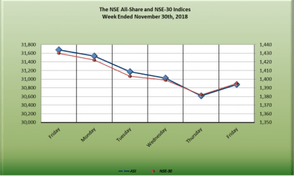 The NSE All-Share Index and Market Capitalization dipped-2.54 per cent to close the week at 30,874.17 points and N11.27 trillion respectively, underpinned on -5.12 per cent and -4.26 per cent fall in the oil and gas sector and NSE premium index respectively. The banking sector did not fare better as it weakened -2.99 per cent, while the industrial goods sector shed -3.36 per cent last week. On Friday, the market gained 0.86 per cent to halt downtrend of five consecutive trading days.