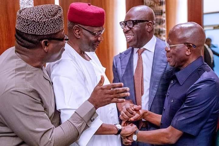In Abuja on Wednesday, in what appeared to be the first sign of ongoing reconciliation effort yielding results, Edo State governor, Godwin Obaseki and his predecessor, Adams Oshiomhole, standing with Africa’s richest man, Alhaji Aliko Dangote; chief of staff to President Muhammadu Buhari, Abba Kyari and Ekiti State governor, Kayode Fayemi held hands and exchanged banters.