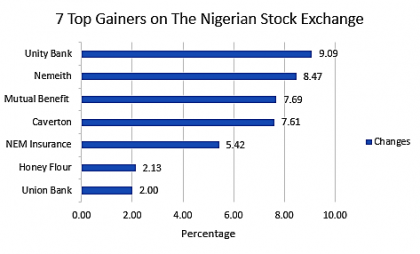 Unity Bank appreciated 9.09 per cent to lead 16 other gainers to top the advancers chart while John Holt shed -9.43 per cent to top 10 other losers.