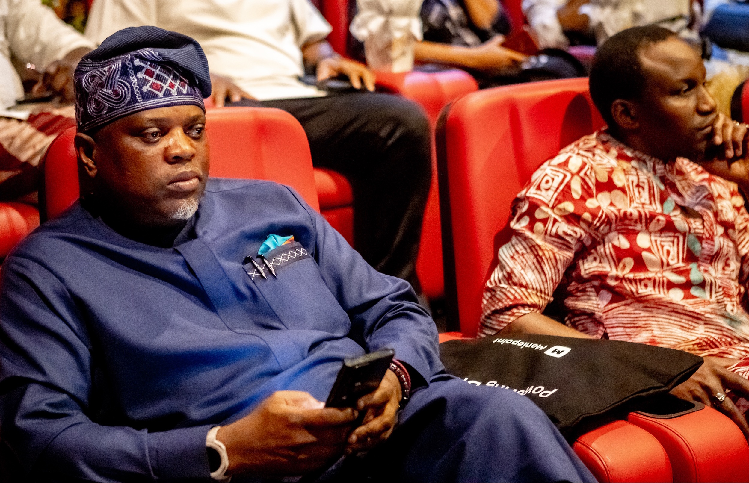 From left: Special Adviser to the President on Economic Affairs in the Office of the Vice President, Dr. Tope Fasua and communications expert, Tolu Ogunlesi watch on with rapt attention during the screening in Abuja