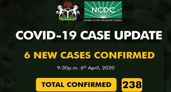 As at 09:30 pm 6 April, there are 238 confirmed cases of #COVID19 reported in Nigeria. Thirty-five have been discharged with five deaths