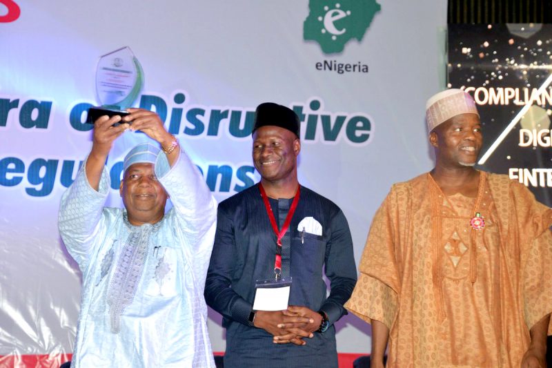L-R: Umaru Ibrahim, Managing Director, Nigeria Deposit Insurance Corporation (NDIC), receives the award of “Best MDA Compliance to IT Clearance Regulations” supported by NDIC Head Information Technology Department, Mr Imade Uhunmwagho and National Information Technology Development Agency (NITDA) Director Infrastructure and Technical Support Service, Dr. Abdullahi Gambo during the 2018 eNigeria Conference Digital Promotion Awards.