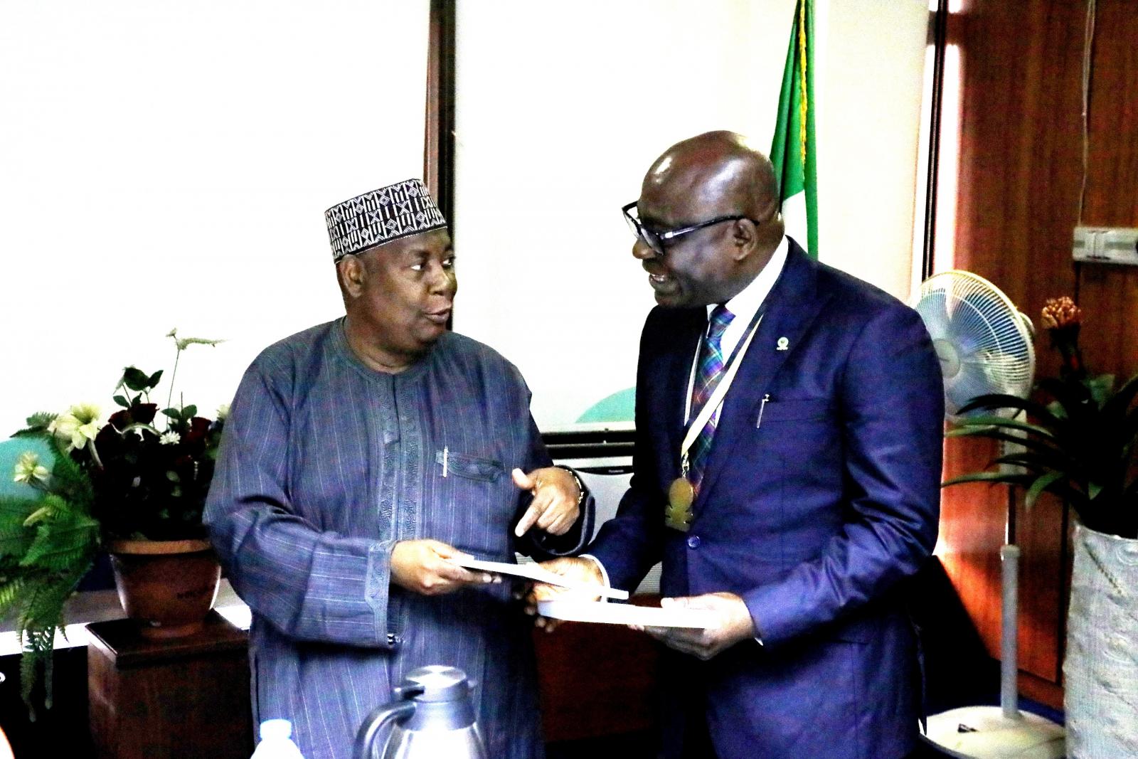 L-R: Nigeria Deposit Insurance Corporation (NDIC) MD, Umaru Ibrahim, presents the Corporation’s research publications to the President and Chairman of Council, Chartered Institute of Bankers of Nigeria (CIBN), Dr. UcheOlowuduring the Council’s courtesy visit to the NDIC Management at the Corporation’s Head Office, Abuja.