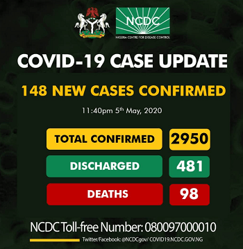 The Nigeria Centre For Disease Control (NCDC), has confirmed 148 new COVID-19 cases in the country, taking Nigeria’s total cases to 2,950.