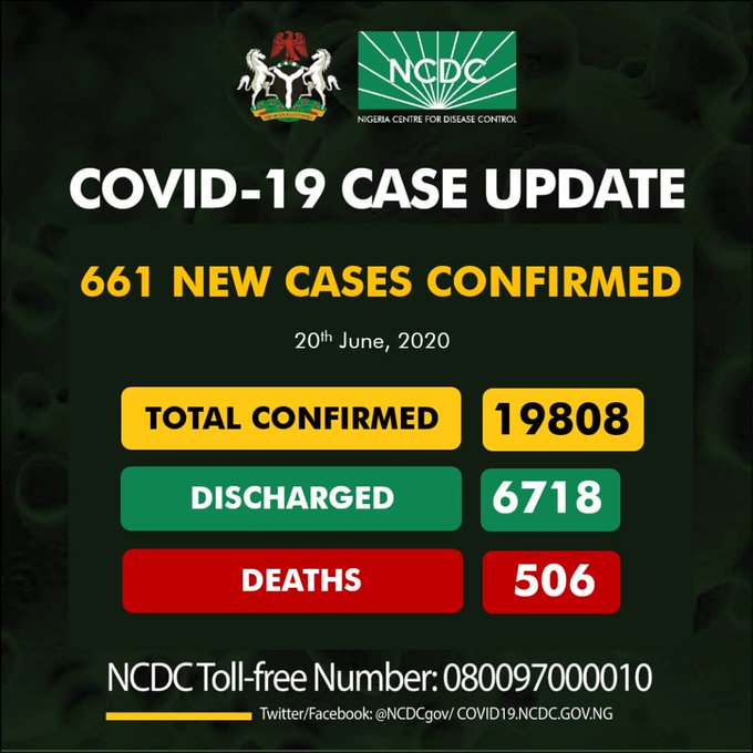 It added that Nigeria now has a total of 19,808 confirmed cases of COVID-19, out of which 6,718 have been discharged with 506 others dead.