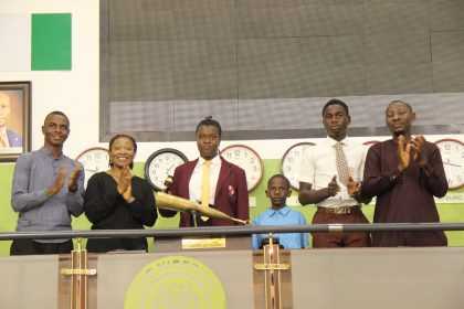 L–R: Head, Corporate Communications, The NSE, Mr. Olumide, Orojimi; S-Tee Cambridge School, Miss Oduniyi Daniella; Chief Human Resource Officer, NSE, Ms. Pai Gamde; Kingdom & Base School, Master Wisdom Ojini; Head, Market Surveillance, NSE, Mr. Abimbola Babalola and Anthony Village Senior High School, Master, Aina Rotimi during the NSE 2019 Global Money Week celebration theme: Learn.Save.Earn at the Exchange in Lagos on Friday.