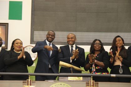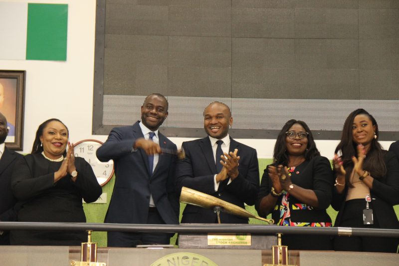 L–R: Mojisola Bakare, Divisional Head, Client Coverage and Wealth, Sterling Bank Plc; Abubakar Suleiman, Managing Director/CEO, Sterling Bank Plc; Mr. Olumide Bolumole, Head, Listing Business Division, The Nigerian Stock Exchange (NSE); Justina Lewa, Company Secretary, Sterling Bank Plc and Enabruke Oju, Capital Management, Sterling Bank Plc during the listing of Sterling Investment Management SPV Plc at the Exchange on Tuesday.
