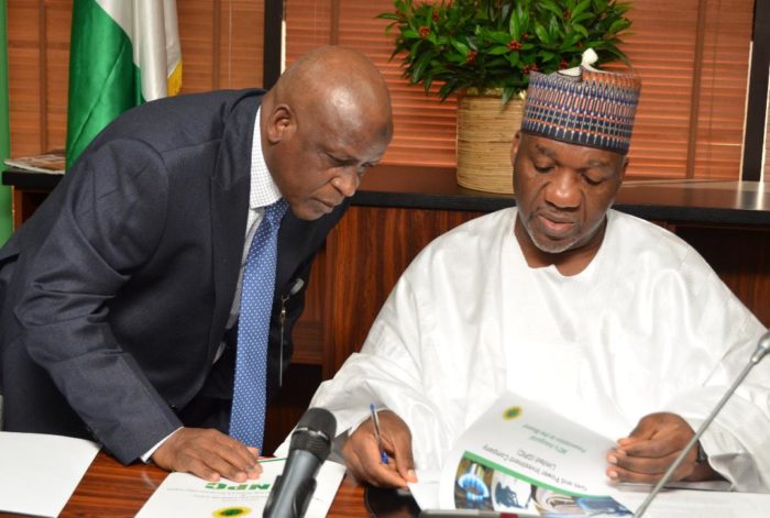 Chief Financial Officer of NNPC and Chairman of the Board of NNPC Power subsidiary, Gas and Power Investment Company (GPIC), Mr. Isiaka Abdulrazaq (right), being shown some documents by Managing Director, Gas and Power Investment Company (GPIC), Mallam Hussaini El-Yakubu, in Abuja on Tuesday. Pix: NAN