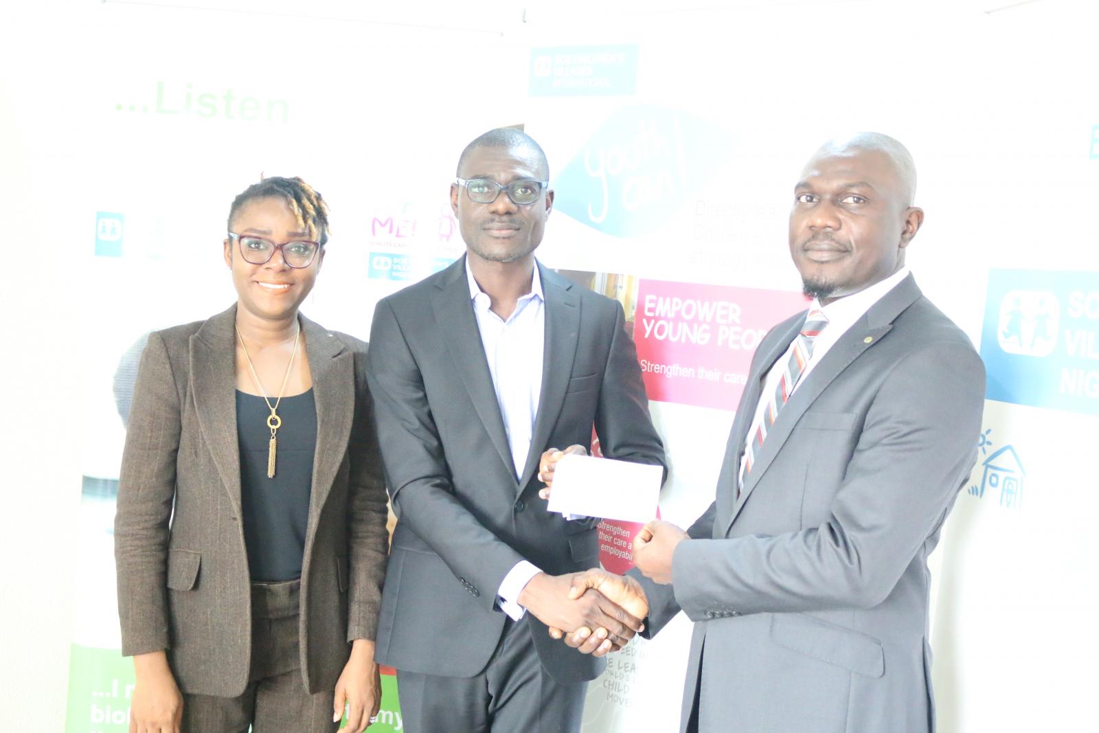 L – R: Temitayo Ade-Peters, Team Lead, CSR, The Nigerian Stock Exchange (NSE); Mr. Gboyega Fadowole-Aje, National Fund Development & Communication Coordinator, SOS Children’s Villages Nigeria and Olumide Orojimi, Head, Corporate Communications Department, NSE during the presentation of cheque to SOS Children’s Village today in Lagos
