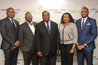L – R shows Mr. Olumide Bolemole, Divisional Head, Listing Business Division, The Nigerian Stock Exchange (NSE); Mr. Oladipo Aina, Managing Director/CEO, Signet Investment and Securities Limited; Chief Patrick Ezeagwu, Chairman, Association of Stockbroking Houses of Nigeria (ASHON); Ms. Ifeyinwa Rita Ejezie, Managing Director/CEO, Cashville Investments & Securities Limited and Mr. Jude Chiemeka, Divisional Head, Trading Business Division, NSE during the Fixed Income Trading Workshop for Dealing Members at The Exchange in Lagos on Monday.