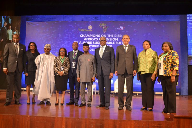 L-R: Mr. Aigboje Aig-Imoukhuede, Ex-officio, The Nigerian Stock Exchange (NSE); Olawale Oluwo, Commissioner for Energy and Mineral Resources, Lagos State; Dr. Oba Otudeko, Past President, NSE; Ms. Mary Uduk, Acting Director General, Securities and Exchange Commission (SEC); Oscar N. Onyema, OON, President, African Securities Exchanges Association (ASEA)/CEO, NSE; His Excellency, Professor, Yemi Osibanjo, Vice President of the Federal Republic of Nigeria; Abimbola Ogunbanjo, President, The Nigerian Stock Exchange (NSE); Karim Hajji, Deputy President ASEA and CEO, Casablanca Stock Exchange; Aruma Oteh, Vice President and Treasurer, World Bank and Yetunde, Odejayi, Personal Secretary, Deputy Governors Office, Lagos State, during the 22nd African Securities Exchanges Association Annual Conference at Oriental Hotel, Lagos on Monday