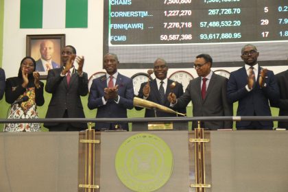 L–R: Head, Human Resource, Fidson Healthcare Plc, Mrs. Joke Alli; Sales & Marketing Director, Fidson Healthcare Plc, Mr. Olugenga Olayeye; Chief Executive Officer, The Nigerian Stock Exchange (NSE), Mr. Oscar N. Onyema OON; Managing Director/CEO, Fidson Healthcare Plc, Mr. Fidelis Ayebae; Chairman, Fidson Healthcare Plc, Mr. Segun Adebanji and Head Finance & Account, Fidson Healthcare Plc during the Closing Gong Ceremony at the presentation of Facts Behind the Offer of Fidson Healthcare Plc at the Exchange in Lagos on Wednesday.