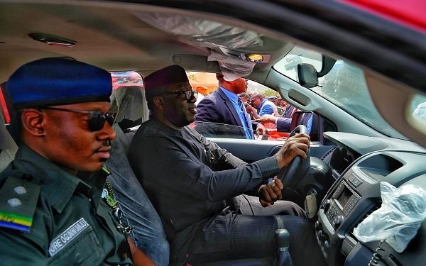 Ekiti State Governor, Kayode Fayemi, test-driving one of the operational vehicles bought for the security outfit