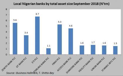 ETI (a bit of a surprise) clearly has the largest total asset base of all banks in the country with a total asset size of N 6.7trn as at September 2018 followed by Zenith Bank (which many thought was the largest Nigerian bank by assets) with an asset base of N5.6trn and FBNH Plc with an asset base of N5.3trn (despite its risk asset troubles). These, no doubt, are among the country’s top three money lenders, deposit takers and non-lending asset creators. Trailing these top three is Access Bank with an asset base of N4.6trn and then the most highly priced financial jewel on the local stock exchange, GT Bank, with a total asset size of N3.4trn. Diamond Bank, Fidelity Bank, Union Bank and StabicIBTC have a combined average total asset base of less than N2trn (or N1.6trn in actual terms).