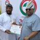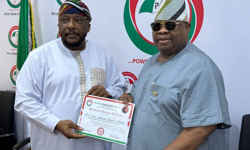 Gov. Adeleke (right) receiving his provisional clearance certificate from a PDP national officer Osun State Governor, Senator Ademola Adeleke, was on Thursday screened as a...