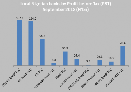 Profitability of the bigger banks has nevertheless been decent. Zenith bank held up a Profit before tax of N167.3 billion in September 2018, as against GT Banks N164.2 billion, with Access Bank strolling in at N24.4 billion behind FBNH’s N51.3 billion and ETI Bank’s N96.3 billion. Say’s Atere, ‘’profit’s in the third quarter were not earth shattering, but they equally held up nicely in the three quarters to September demonstrating that banks are coming down heavily on the poor quality of their loans and the rather fat size of their operating expenses relative to their incomes’’, he observes.